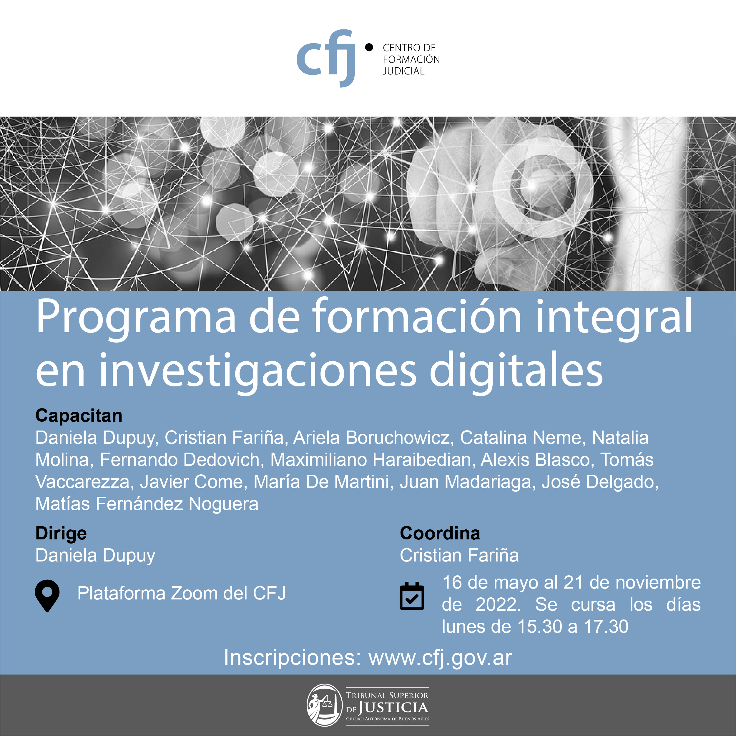 Se tratará de una capacitación integral, comprensiva de las distintas áreas que rodean el universo del cibercrimen, consistente en la sensibilización y concientización del fenómeno; los desafíos de los delitos y las normas procesales adaptadas a las nuevas tecnologías; proyectos de reforma legislativa; contexto internacional, métodos disruptivos de investigación en entornos digitales e informática forense.