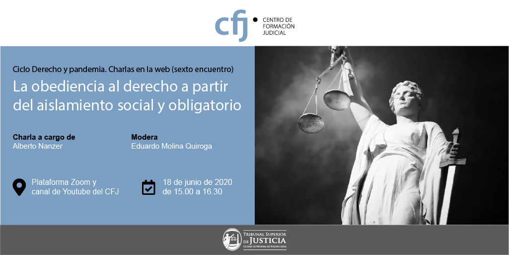 El Centro de Formación Judicial llevó a cabo el jueves 18 de junio de 2020 un nuevo conversatorio como parte del “Ciclo Derecho y pandemia. Charlas en la web” bajo la consigna “La obediencia al derecho a partir del aislamiento social y obligatorio”. El expositor en esta oportunidad fue el Dr. Alberto Nanzer y el moderador fue el Dr. Eduardo Molina Quiroga, Secretario Ejecutivo del Centro de Formación Judicial.